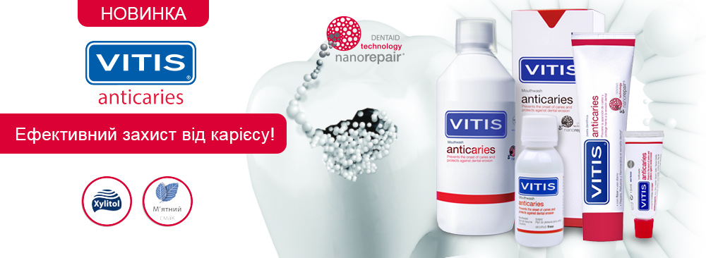 Серія VITIS ANTICARIES спеціально розроблена для запобігання виникненню карієсу на трьох різних рівнях. Протидія карієсу забезпечується завдяки потрійному впливу, а саме: відновленню, зміцненню та ремінералізації емалі, що найкращим чином попереджує розвиток карієсу.